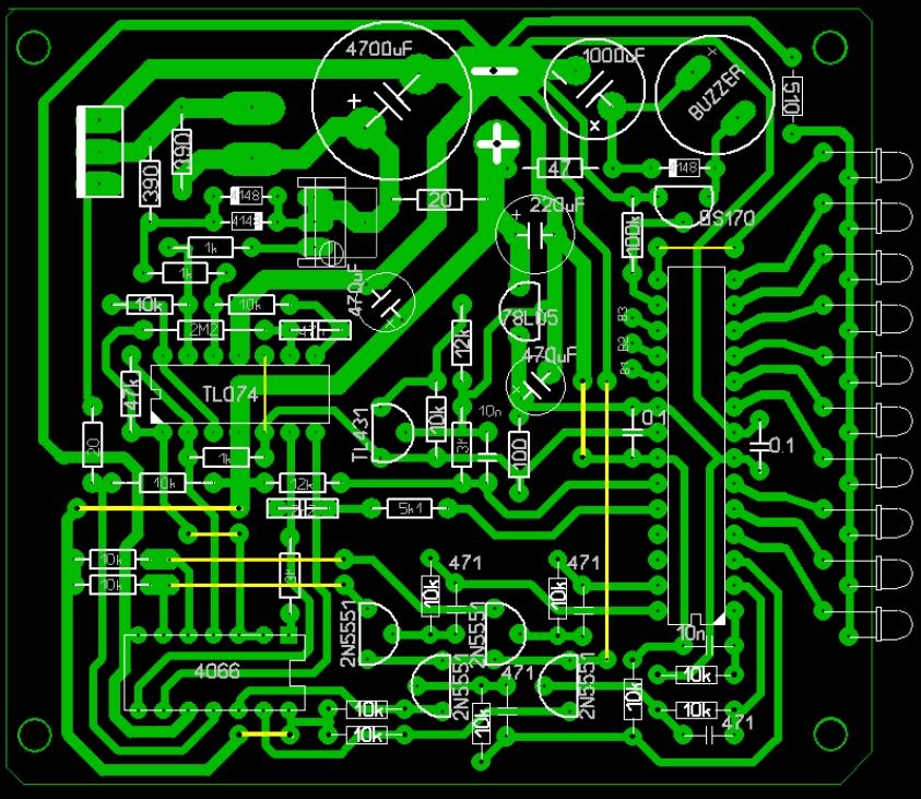 Для изготовления блока управления необходимо сделать монтажную плату, на которой будут размещаться все необходимые радиокомпоненты. Схему, представленную ниже, нужно перенести на гетинаксовую пластину с покрытием из медной фольги и изготовить монтажную плату таким же образом, как описано выше в статье для металлодетектора «Пират». Размер схемы должен быть в пределах 104×66 мм, а заготовка для платы на 10 мм больше с каждой стороны.