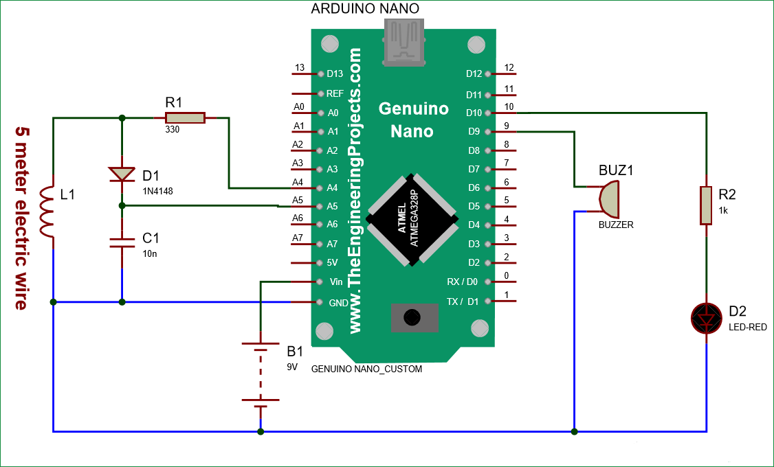 Плата Arduino используется для управления всеми процессами в схеме. Светодиод и зуммер используются как индикаторы обнаружения металла. Катушка и конденсатор используются для обнаружения металла. Импульсный диод используется для уменьшения напряжения. Резистор используется для ограничения тока на контакте платы Arduino.