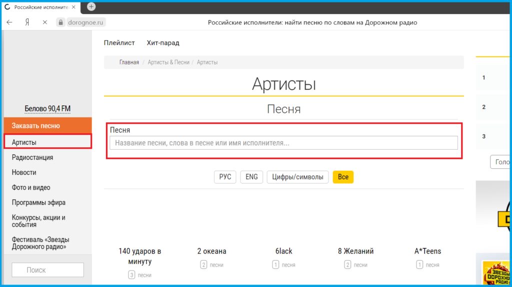 Функционалом ресурса предусмотрена возможность найти песню по исполнителю или словам из её названия. Для этого на главной его странице следует нажать на пункт “Артисты” в колонке справа. Отобразится уже знакомая нам поисковая строка, в которой и нужно написать ваш запрос, чтобы найти музыку.