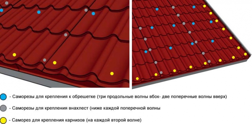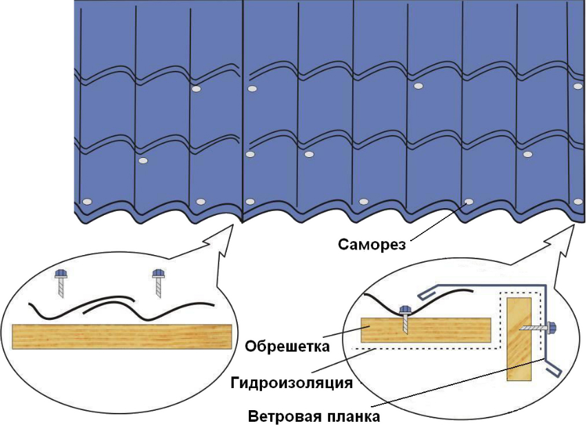 При этом важно, чтобы по краю материал фиксировался на деревянной обрешетке через волну. Общепринятой считается следующая схема: