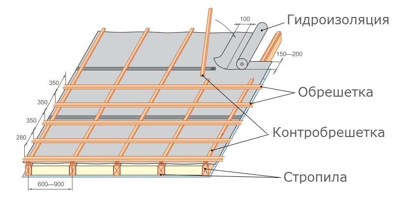 Обрешетка и контробрешетка под металлочерепицу образуют конструкцию, в которой вторая, с одной стороны, служит каркасом для сооружения опалубка, а с другой – дополнительно фиксирует гидроизоляцию.