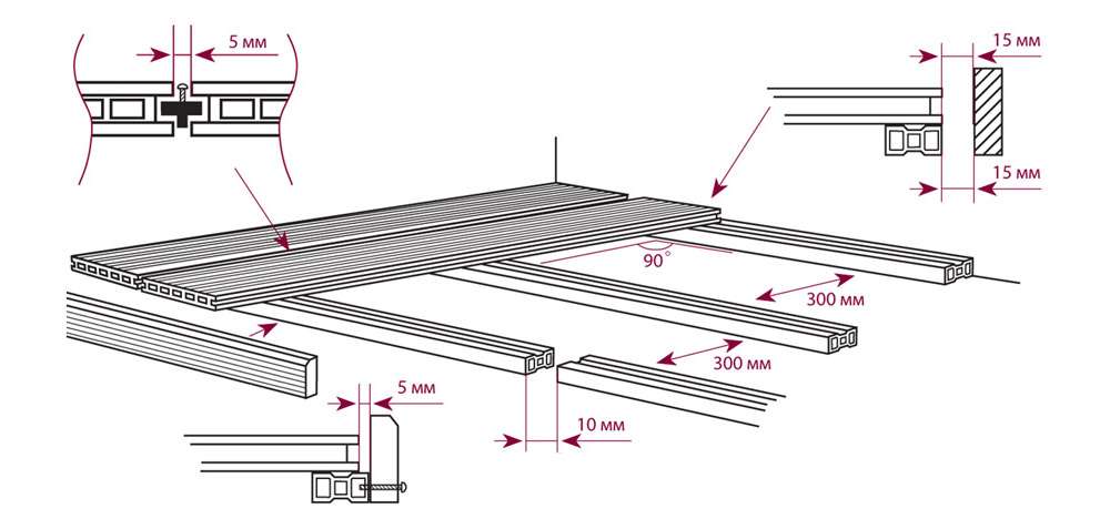 Из-за способности декинга изменять свои размеры при колебаниях температуры и влажности воздуха при укладке террасной доски оставляют компенсационные зазоры: