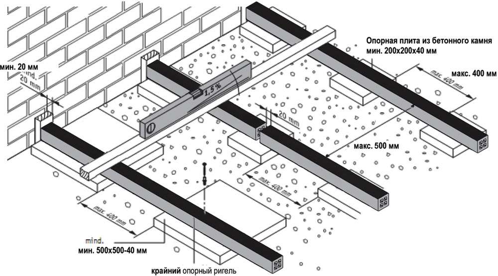 Чтобы вода лучше стекала, лаги устанавливаются параллельно спуску воды. Если спуск сделать не получается, то для создания водоотвода, при установке лаг, под них подкладывают опоры из пластмассы.