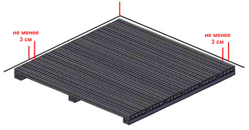 Обязательно следует заранее оставить место для линейного расширения досок. В местах, где декинг устанавливается рядом со стеной, зазор между краем поверхности декинга и стеной должен составлять от 20 до 30мм