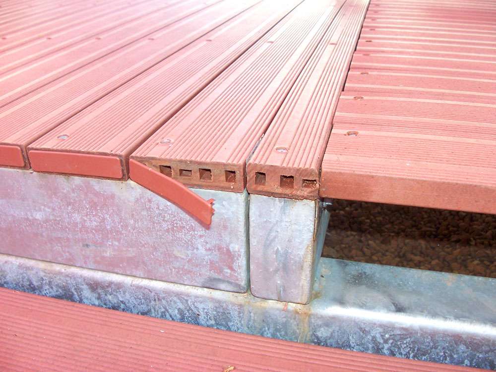 Для укладки террасной доски из ДПК необходимо использовать специальные композитные лаги. Если длина покрываемой поверхности большая, то лаги укладывают встык, между собой не соединяют и оставляют зазор 6-7 мм.