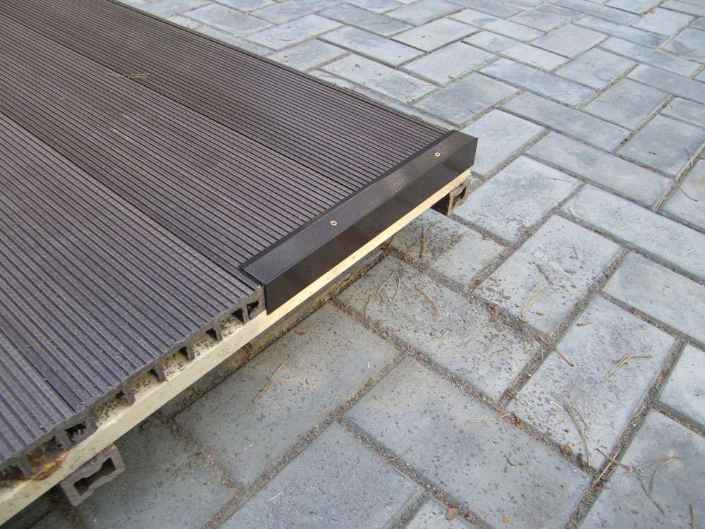 Заключительным этапом монтажа террасы является окантовка террасы уголком дпк или торцевой планкой по периметру. Крепление уголка или планки осуществляется саморезом.