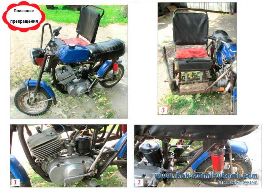 Важно, чтобы он был надежно прикреплен и не двигался во время езды. Для данного вида самодельного мотоцикла нужно закрепить хомутами следующие детали на определенных местах: