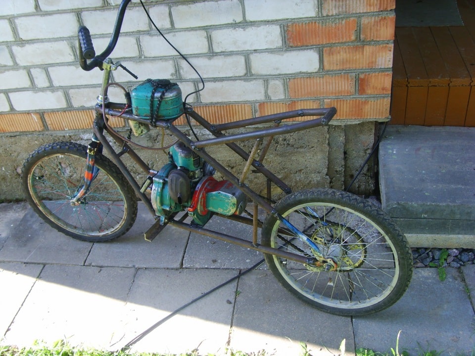Во-первых, мы сперва разберем наиболее простой и доступный вариант того, как сделать мопед из бензопилы с фотографии выше. При сборке часто возникает вопрос, как поставить мотор от бензопилы на велосипед