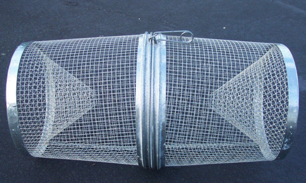 Это приспособление похоже на предыдущую ловушку тем, как в нее попадают раки – через конус. Для изготовления такой раколовки лучше брать металлическую мелкоячеистую сетку.