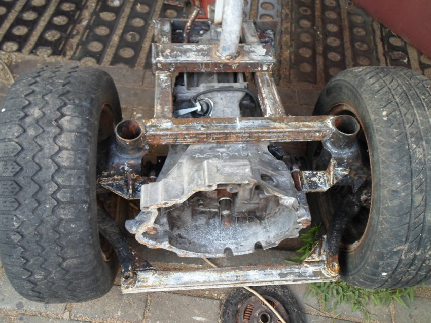 - Собираем раму: используем сварочный аппарат, целесообразно использовать цельный металл. Делаем конструкцию жесткой. Конструкция рамы состоит из двух лонжеронов, задние концы требуется изогнуть кверху, а передние скрепить сваркой. К задней части присоединяем блок управления с рычагами. Между собой лонжероны соединяем поперечными планками. Передняя планка будет играть роль подставки для трансмиссии и аккумуляторной батареи.