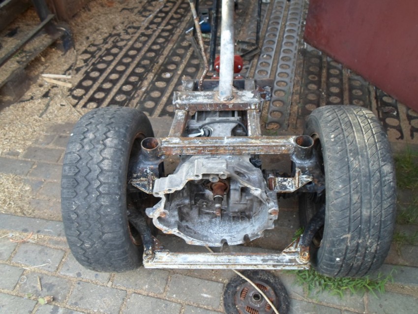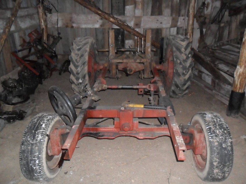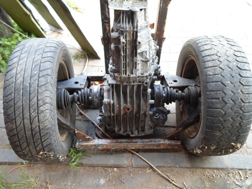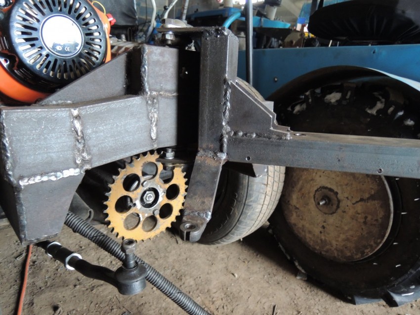 Для задней оси на заготовленную трубу устанавливаются запрессованные подшипники во втулки. Ось, для получения крутящего момента, подсоединяется через шкив со двигателем. Колёса, в зависимости от мощности устройства, можно использовать и от небольшого автомобиля. Если мощность небольшая и обрабатываемая площадь будет небольшой, то можно использовать и отдельно продаваемые колёса с внутренней камерой небольшого диаметра.