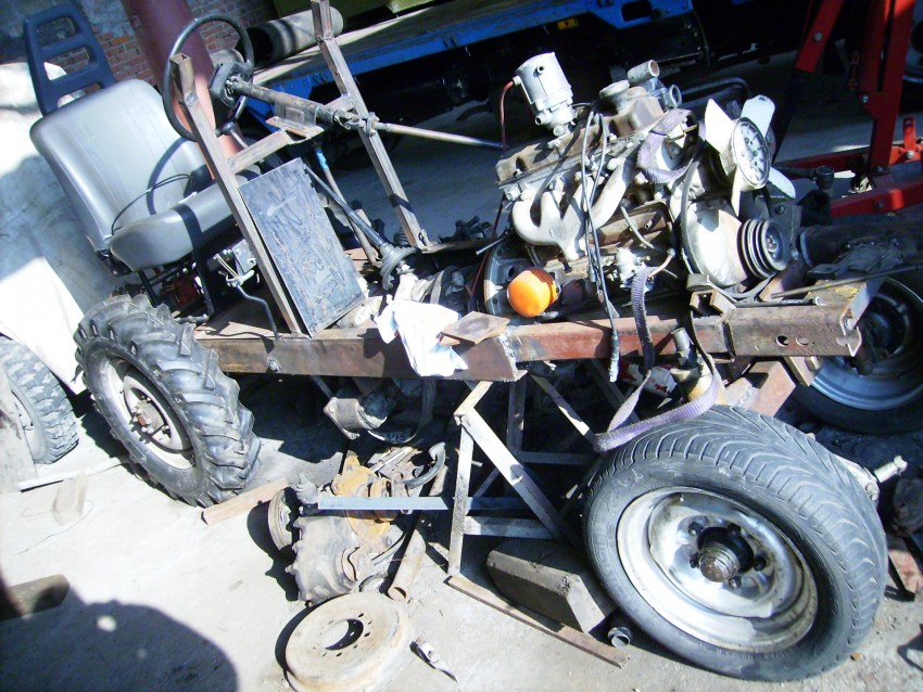 Подготовленный двигатель монтируют в жёсткие хомуты. Их предварительно приваривают к передней части рамы самоделки, затем надёжно стягивают болтами (весь процесс хорошо показан на видео).