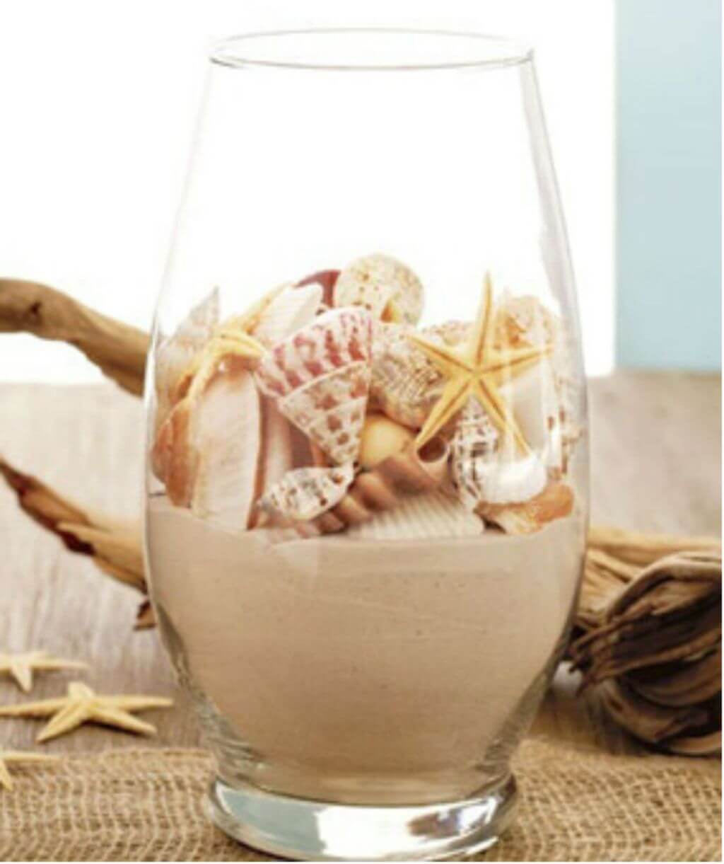 Песок с пляжа может стать частью композиции, напоминающей о лете. Его можно совместить с ракушками в прозрачной вазе: