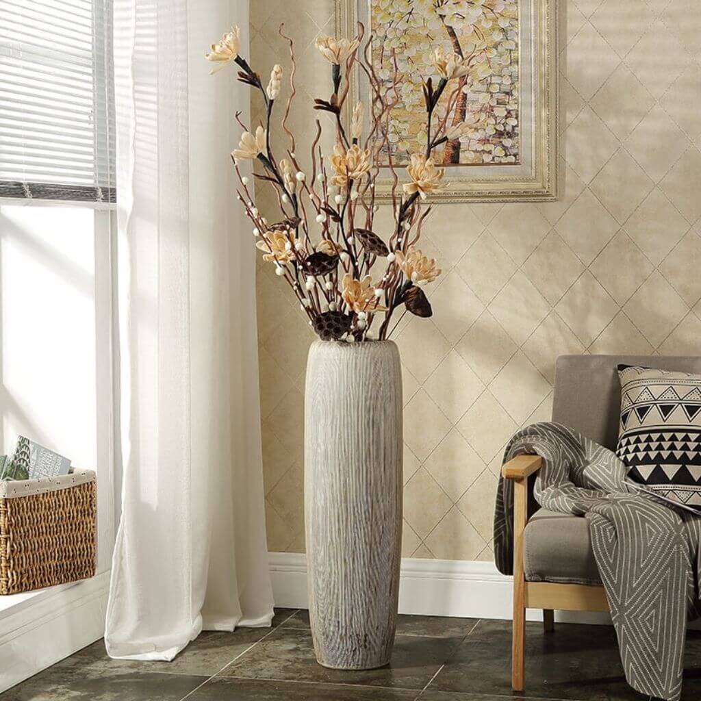 Поэтому декор для напольных ваз лучше использовать простой и не броский. Она и так заметна благодаря габаритам.