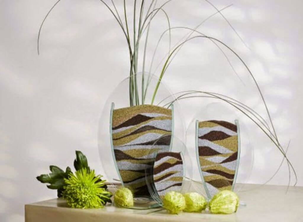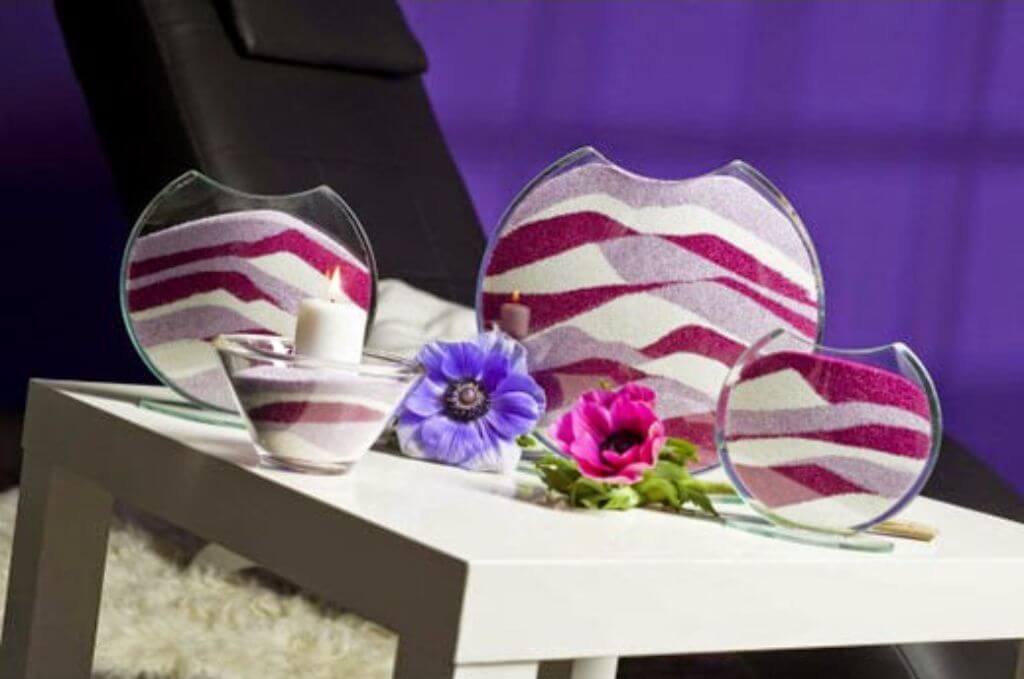 Получится целое произведение искусства, если песок покрасить в несколько оттенков. Наполните прозрачную вазу, чередуя разноцветные слои.