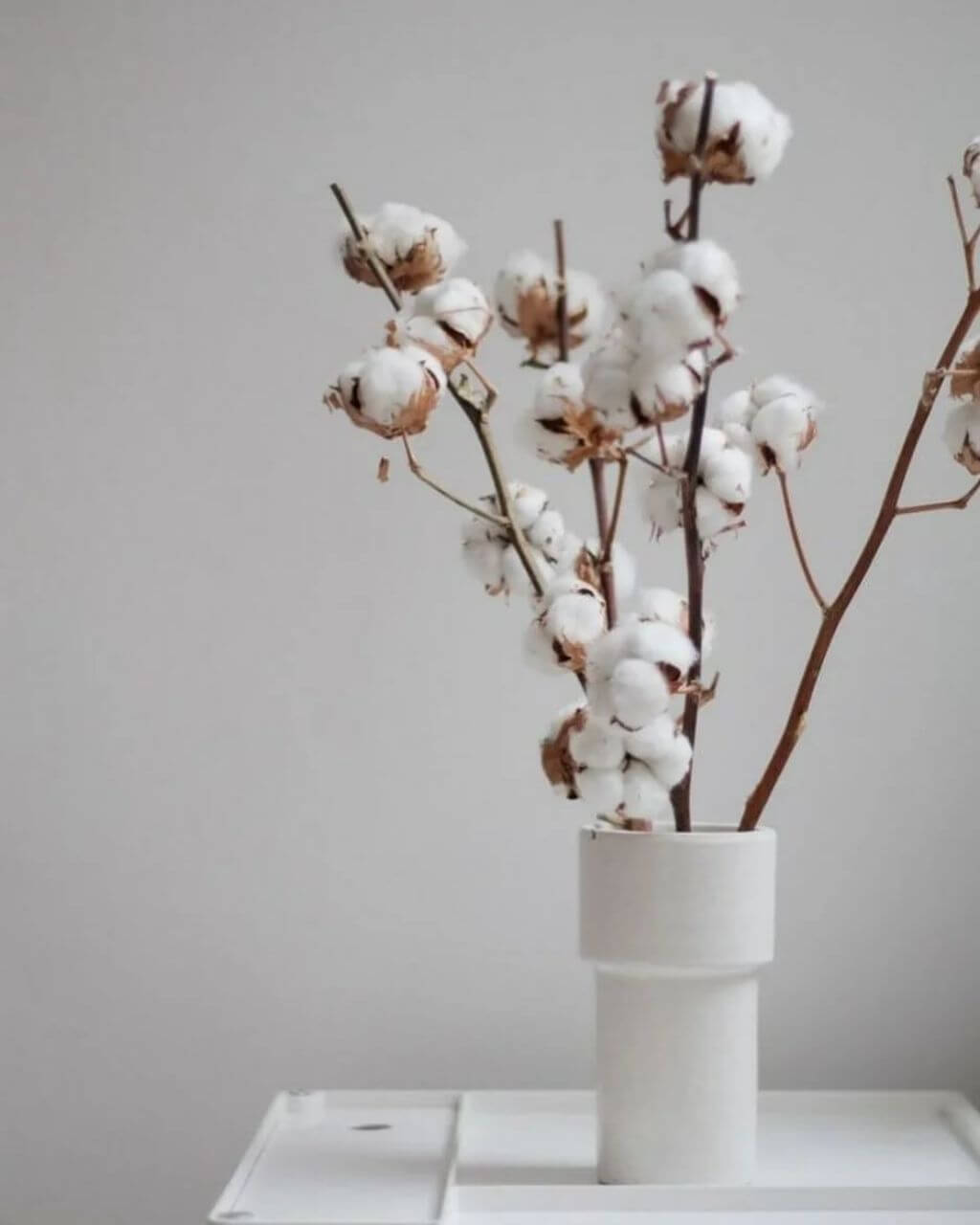 Веточки хлопка продаются в цветочных магазинах. Их используют в составлении интерьерных букетов и венков. Хлопок самодостаточен сам по себе в напольной и настольной вазе.