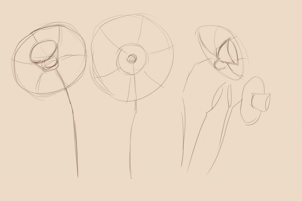 Начальный этап создания рисунка заключается в том, чтобы правильно разместить наши цветы на листе бумаги. Намечаем стебли и ракурс каждого из цветков. Оставьте для каждого растения достаточно пространства.