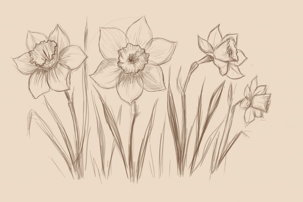Реалистичные нарисованные нарциссы карандашом — это проект для более опытных любителей рисования, поскольку он потребует от вас умения хорошо работать с тенью.