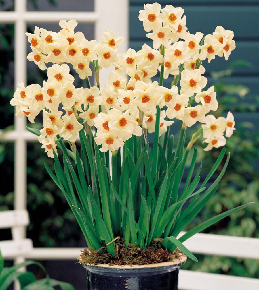 Тацетные или многоцветковые – самый ранний сорт, на одном цветоносе вырастает целый букет цветков (до 20), которые обладают очень насыщенным ароматом. Красивые цветки среднего размера расположены на высоком цветоносе (около 45 см), окраска жёлтая и белая, коронка оранжевая или белая.
