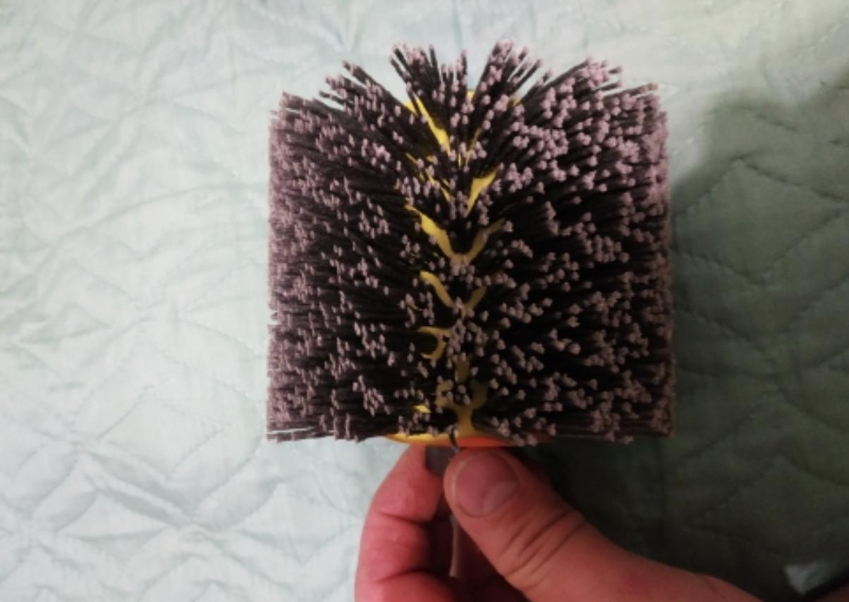 Щетка представляет собой закрепляемый на «болгарку» валик с щетиной из полимерных материалов. Ширина «валика» – 100мм. Диаметр – 120 мм.