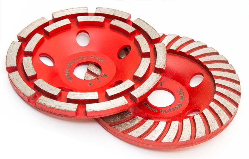 Алмазными чашками с двухрядными сегментами устраняют крупные дефекты на бетоне. Они легко справляются с большими наплывами, выступающими швами. Ими можно уменьшить толщину стяжки. Поверхность после обработки шероховатая, финишную шлифовку проводят другой насадкой.