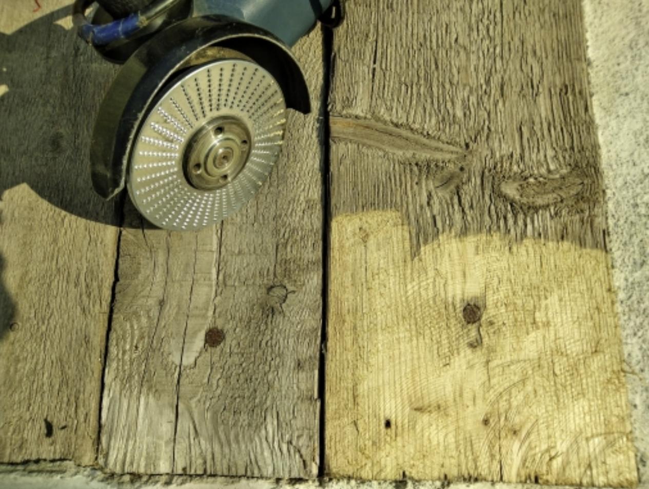Мягкие породы дерева обрабатываются насадкой на болгарку с крайней осторожностью, т.к. инструмент может заклинить и вырвать из рук