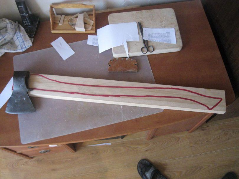 Изделие будет монолитной формы. После того как заготовка получила примерные очертания, необходимо переходить к выточке лезвия. Оно имеет зауженную книзу форму и множество зазоров. На ручке необходимо предусмотреть канавки для пальцев, чтобы готовый атрибут было удобно держать в руке.