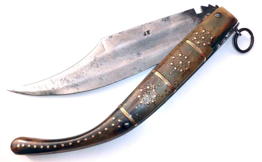 Навахо – классический испанский нож, который изготавливается с ручкой из рога. Форма рукояти изогнутая, поэтому выпрямлять рога, менять их конфигурацию не нужно. Главное – выбрать правильную часть головного «украшения» животного. Так как это складной нож, то рог для рукояти обрабатывается в полном объеме – например, сердцевина вычищается полностью, в качестве материала остается только верхний роговой слой.