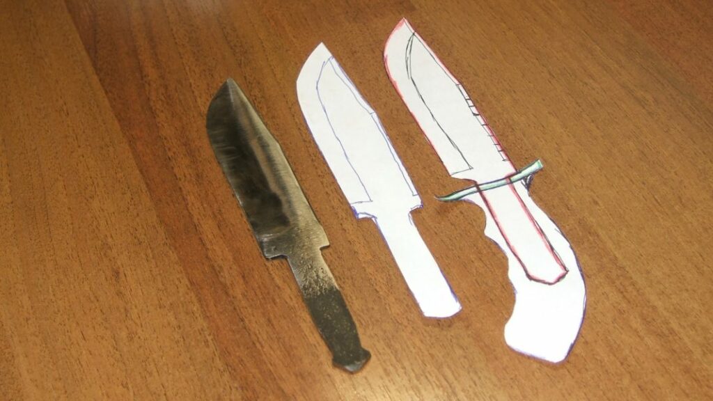 Начинаем работу с шаблона. Проще говоря, нам понадобится выкройка для ножен. Причем для конкретного ножа, который будет лежать там удобно, не мешая хозяину при ходьбе. И выходить из них быстро и легко.