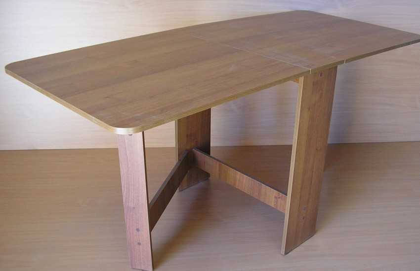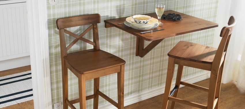 - Откидной. Он представляет собой небольшую столешницу, прикрепленную к стене. В сложенном виде мебель находится в вертикальном положении и не занимает места. В разложенном виде конструкция превращается в столик, который опирается на одну ножку. Его преимущества: компактность, экономия пространства, простой процесс изготовления и монтажа, разнообразие форм. На крепления оказывается большая нагрузка, поэтому прослужат они не очень долго.