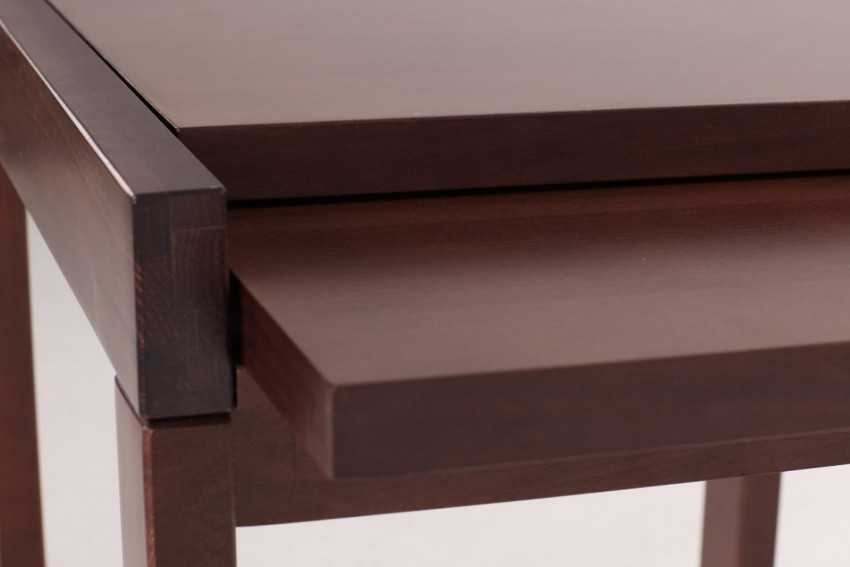 - Трансформер. Этот предмет мебели удобен и функционален, позволяет освободить пространство в небольших домах. Размер конструкции колеблется в зависимости от уровня расклада. В разобранном виде изделие может служить в качестве обеденного стола. Столешница увеличивается в 2-3 раза. Также в некоторых моделях можно регулировать высоту. Недостатком такой мебели является недолговечность креплений и фурнитуры.