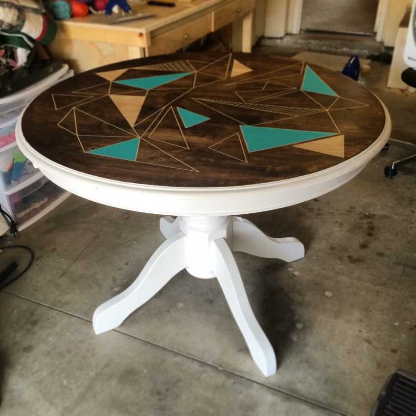 Декорировать конструкцию можно при помощи металлического обода – такой способ подходит для тяжелых столов. Еще используется метод креативного окрашивания. Для этого требуются малярный скотч или трафареты. Интересным вариантом является декупаж. Вырезанные из салфеток или журналов картинки приклеиваются при помощи клея ПВА. После высыхания стол покрывается бесцветным лаком несколько раз.