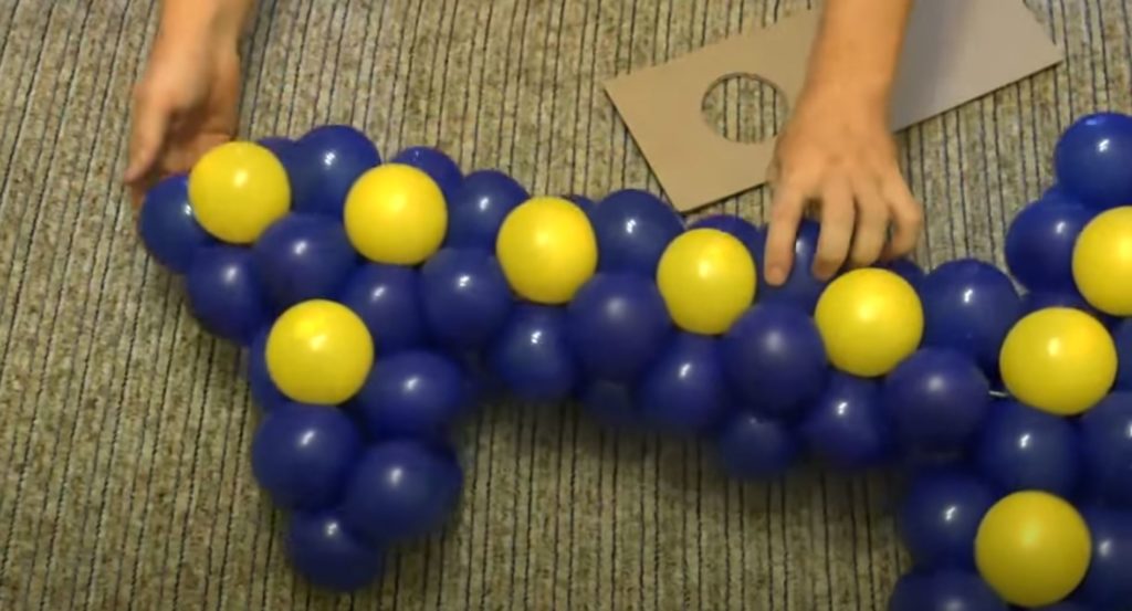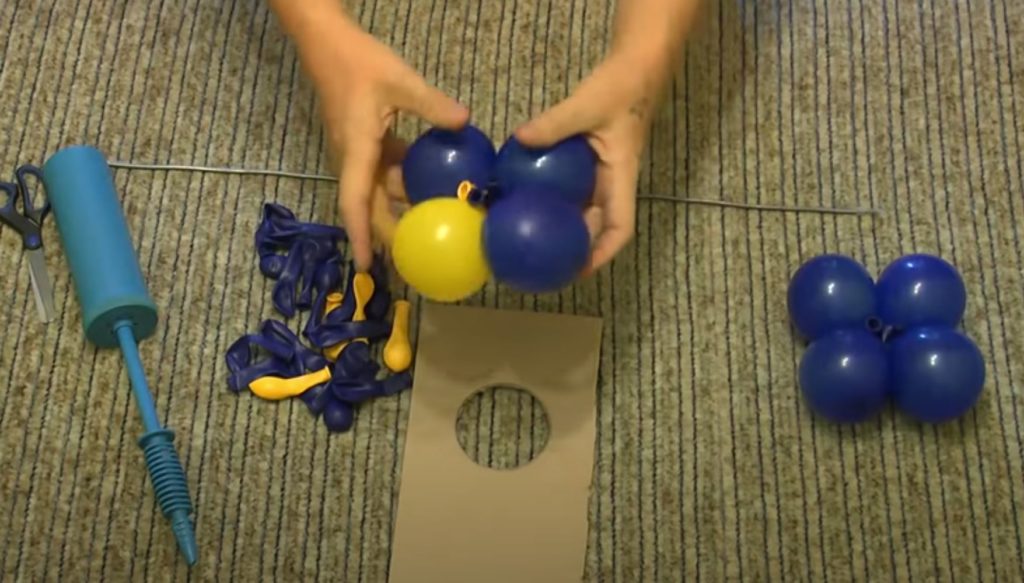 Берем кусок картона и посередине вырезаем ровный круг, это будет шаблон для величины всех шариков. Затем надуваем все шары, обязательно сравнивая их с шаблоном.