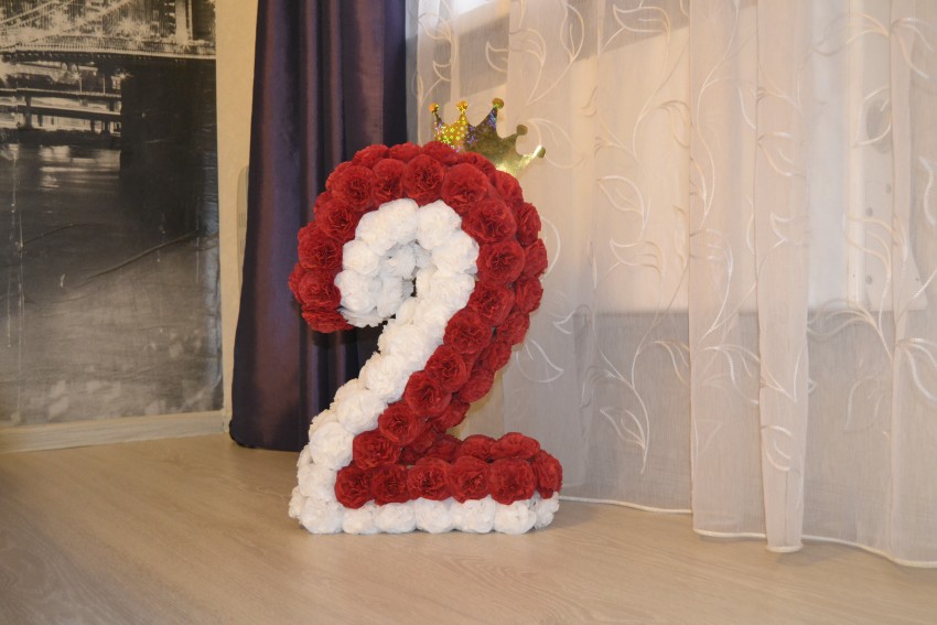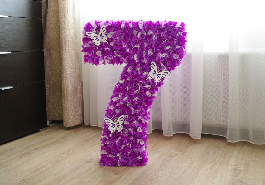 Из папирусной или гофрированной бумаги можно сделать красивые и пышные цветы. Для этого стопку из 6-ти листов бумаги складываем мелкой гармошкой и разрезаем на три равные части. Каждую гармошку перевязываем ниткой посередине, округляем концы и выворачиваем бумагу так, чтобы получились лепестки. Когда будет сделано достаточное количество цветов, приклеиваем их к цифре из картона или пенопласта.