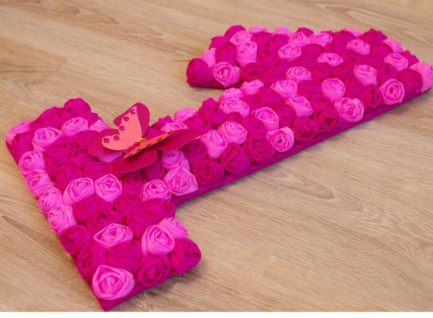 Цифры, декорированные розочками из гофрированной бумаги, выглядят нежными и воздушными. Создание такого декора – это довольно трудоемкий процесс, но результат того стоит. Для этого гофрированную бумагу нарезаем на длинные полоски. От ширины полосок будет зависеть размер будущего цветка. Ленту из бумаги слегка сминаем руками, после чего начинаем скручивать, немного отгибая края, чтобы получились лепестки. Остаток ленты скручиваем у основания получившегося цветка. Аналогичным способом изготавливаем нужное количество розочек, после чего приклеиваем их картону при помощи горячего клея.