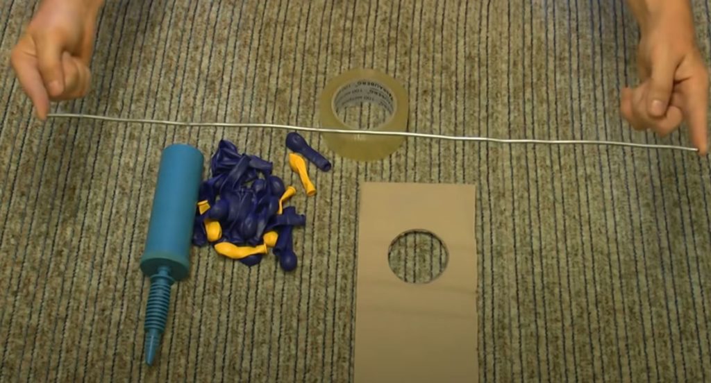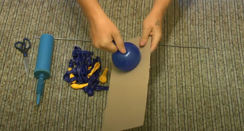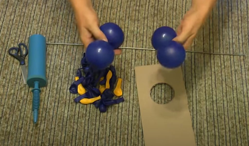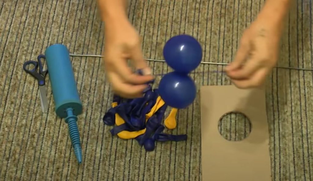 Покупаем шарики с диаметров до 10см. Количество шариков зависит от высоты изделия. Помимо этого, нам понадобится скотч, ножницы, насос, два шарика для продольного моделирования, ровная проволока и кусок картона.