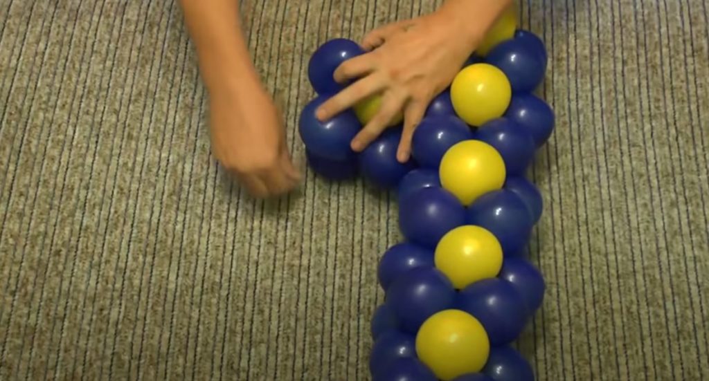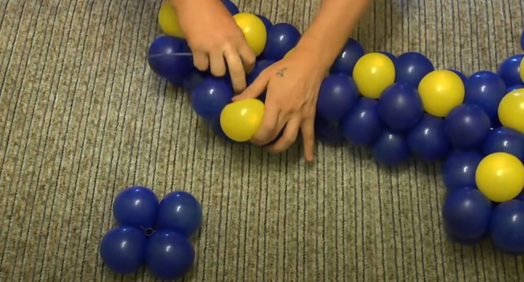 Повторяем процедуру, однако с небольшим дополнением – в одной паре меняем один шарик на другой цвет. Таким образом получится в четверке шаров один другого цвета.