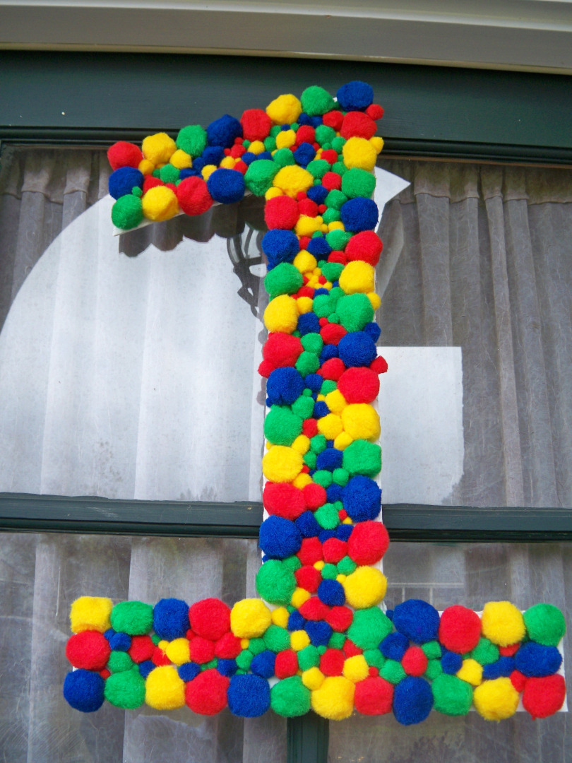 Для начала необходимо сделать много помпонов из шерстяных ниток. Для их изготовления потребуется два одинаковых по размеру кольца, вырезанных из плотного картона. Кольца накладываем друг на друга и обматываем их шерстяными нитками до тех пор, пока не закроется отверстие кольца. Затем разрезаем нитки ножницами по краю, немного раздвигаем кольца и перевязываем нитки. Снимаем заготовки из картона и встряхиваем помпон. По такому же принципу изготавливаем необходимое количество помпонов. Готовый декор приклеиваем к картонной цифре на горячий клей.