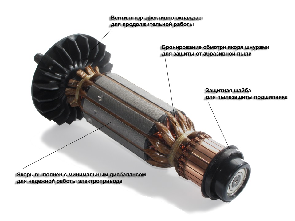 Якорем является вращающаяся деталь, имеющая обмотки, чтобы создавать нужный крутящий момент, который передается редуктору электродвигателя. Такие же обмотки имеет статор, который поделен на несколько частей. Электрический ток приходит на обмотку через угольную щетку и поступает к якорю. Затем ток приходит на следующую щетку и так далее, пока не будут задействованы все сектора статора.