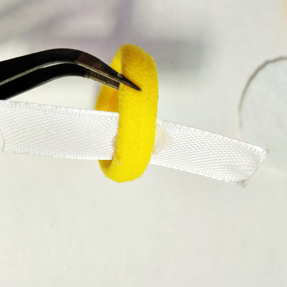 Крепить основу к резинке можно и при помощи прямоугольного элемента из фетра. Для этого на середину полоски капнуть клей и соединить ее с резинкой. Далее части прямоугольника, расположенные по обеим сторонам от элемента, нужно смазать клеем, чуть не доходя до кончиков. После этого следует присоединить полученную заготовку к круглому основанию из фетра. Оставшиеся концы необходимо обрезать, подравняв по форме круга.