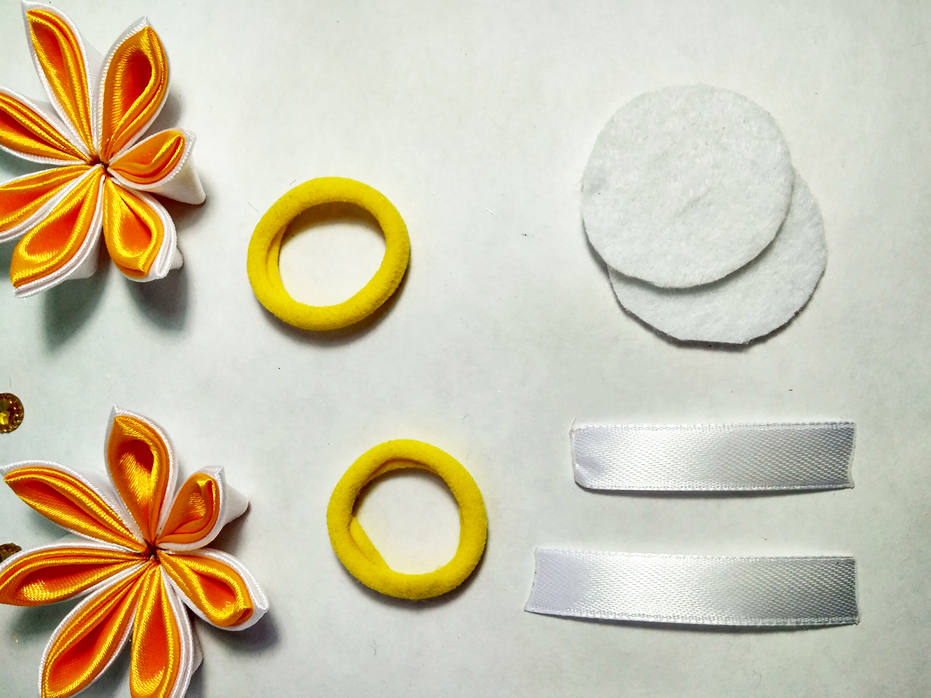 Готовые банты и цветы канзаши из лент могут стать частью резинки, заколки. Присоединять заготовку клеем непрактично и некрасиво. Крепление лентой выглядит гораздо аккуратнее, для этого: