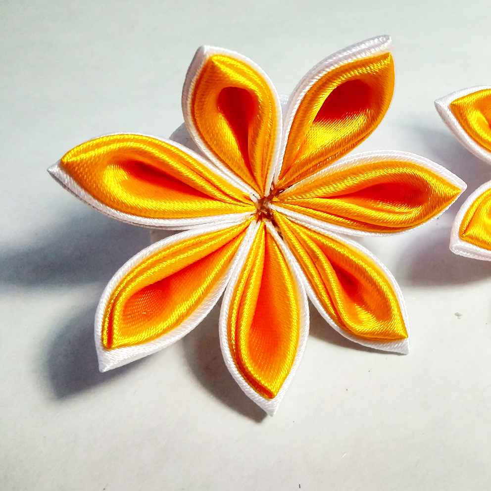 Мастерицы канзаши умеют обращаться с лентой, а именно, складывать кусочки определенной формы и размера в лепестки и листочки разных цветочков. Лепестки можно моделировать из лент разных цветов, собирать их необычным способом в чудные изделия. Традиционная фурнитура для канзаши – атласные ленты, они могут быть разного размера, расцветки, однотонные или декорированные горошком, цветочками и другим орнаментом. На втором месте по популярности стоят органза, репсовая лента, шелк, люрексовая ткань, кружево. Поскольку атласная лента доступна и стоит дешево, ее используют в качестве основного материала для изготовления изделий, все остальные обычно используют в качестве дополнения.