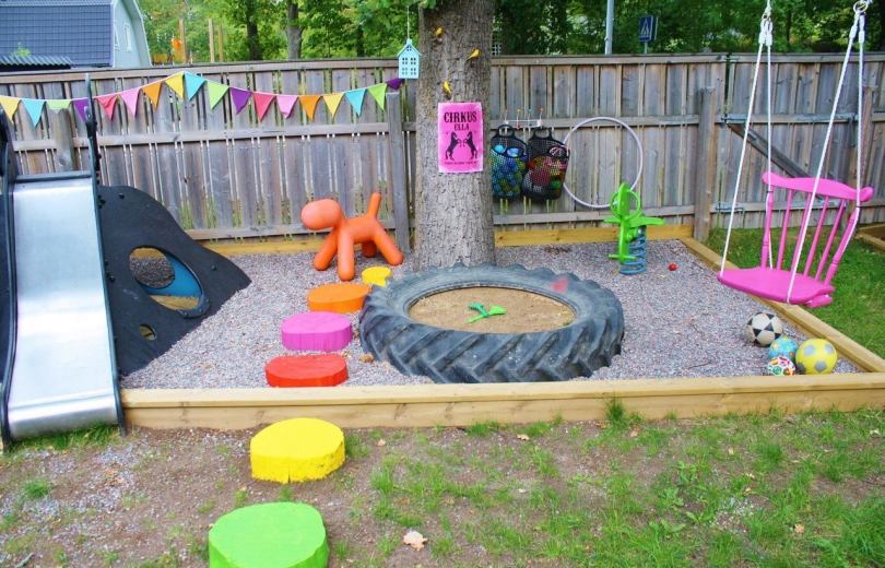 Также желательно установка зонта для защиты от палящих лучей. В качестве мини-песочницы может послужить ненужная покрышка, которую можно покрасить в разные цвета.
