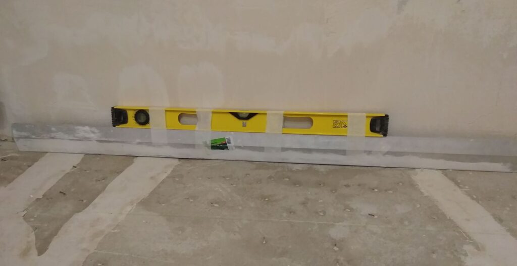 Леску выставляем по строительному уровню. Для увеличения точности строительного уровня его можно приклеить малярным скотчем к правилу длиной 1.5-2м. Таким образом получиться длинный уровень.