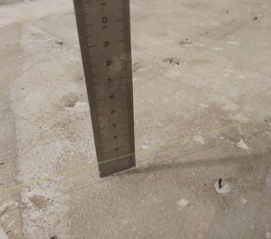 Теперь определяем среднюю толщину заливаемого пола. Для этого к натянутой леске подставляем линейку в разных местах и записываем значения.