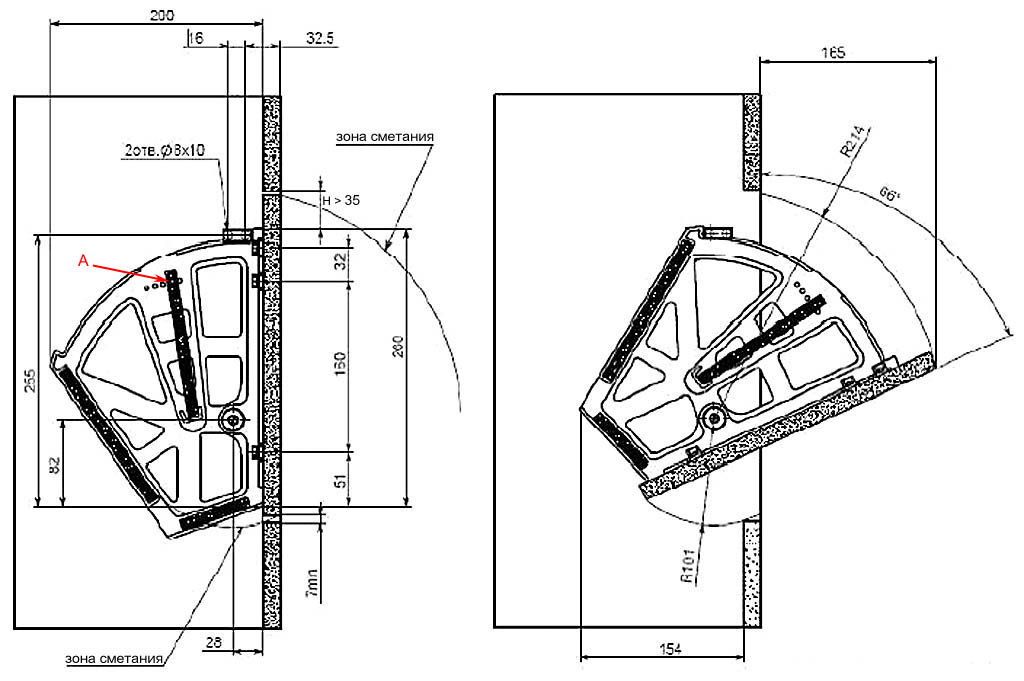 Ширина сиденья пуфа и обычной скамьи ок. 400 мм. В узкой прихожей с ними на проход остается меньше, чем требует эргономика, да еще и вешалка с одеждой тут же. Поэтому в настоящее время популярны стали т. наз. лепестковые обувницы (поз. 4); обувь в них хранится в вертикальном положении на полках откидных лотков, укрепленных между секторными поворотными боковинами – лепестками. Сделать обувницу лепесткового типа возможно шириной 250-260 мм: присесть хватит, и в прихожей шириной 1,25 м остается проход ок. 1 м, что приемлемо. Кроме того, лепестковая обувница обеспечивает хорошую вентиляцию содержимого как при закрытых, так и при открытых лотках. А если лоток откинуть, то обувь в нем сохнет лучше, чем на полках под скамейкой.