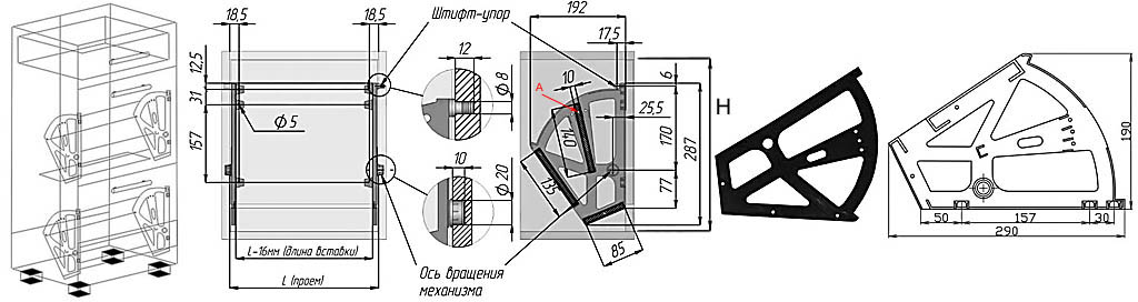 На средней полке в точке А (она на чертеже отмечена красным цветом) ставятся шариковые фиксаторы или же съемные штифты, с помощью которых в процессе эксплуатации будущего изделия станет возможным регулировать положение полки в зависимости от ее содержимого.
