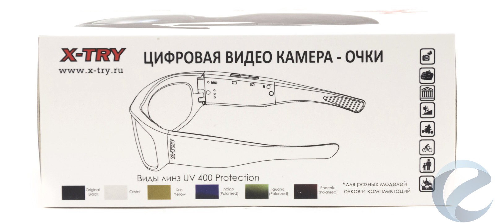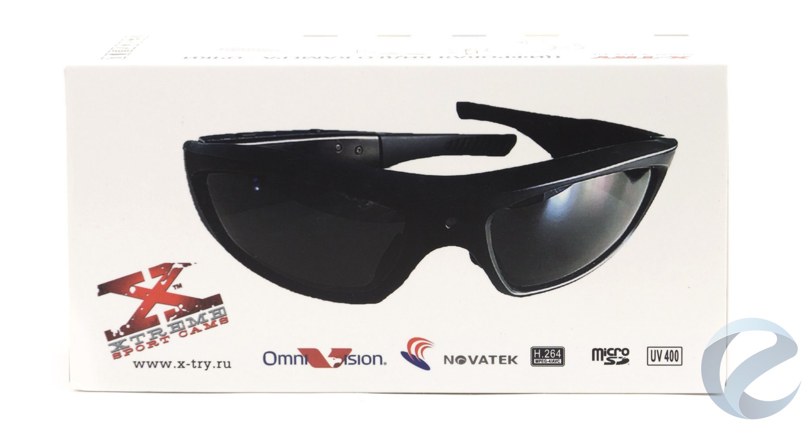 - X-TRY XTG300C. Корпус очков оформлен в стильном черном цвете, который дополнит любой образ. Конструкция защищена от температурных перепадов, влаги, механических воздействий. Благодаря широкоугольному объективу камеры снимки получаются качественным, разрешение – 4000 х 3000 Р. Модель дополнена прозрачными линзами с поляризацией.