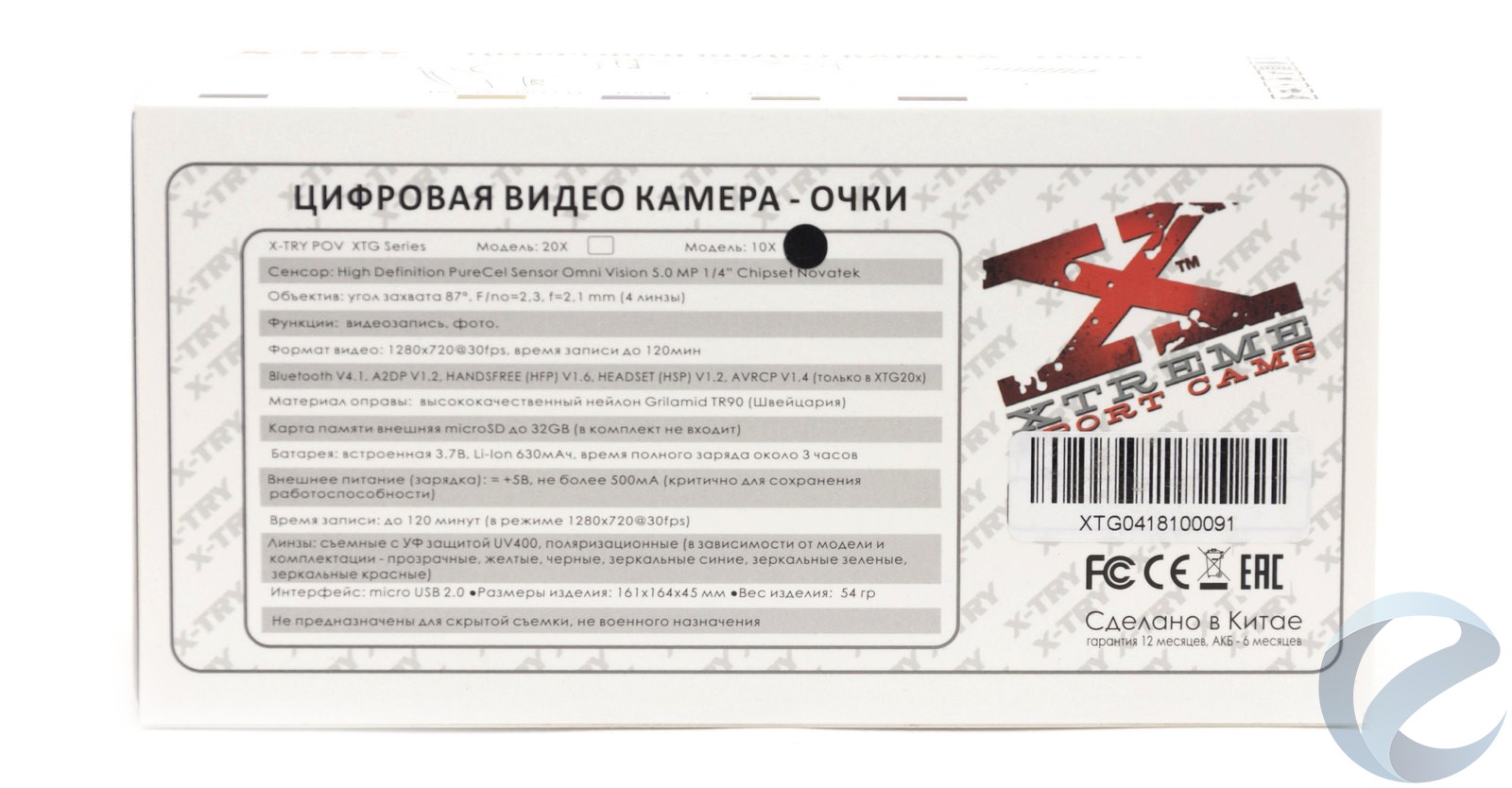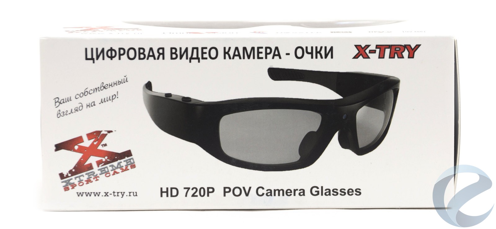 - X-TRY XTG100 HD ORIGINAL. Корпус состоит из качественного нейлона, объектив рассчитан на 4 линзы, обеспечивает угол обзора 87º. Данные сохраняются на картах microSD до 32 GB. Подключение очков к компьютеру осуществляют при помощи стандартного USB . Вес устройства составляет 54 г.