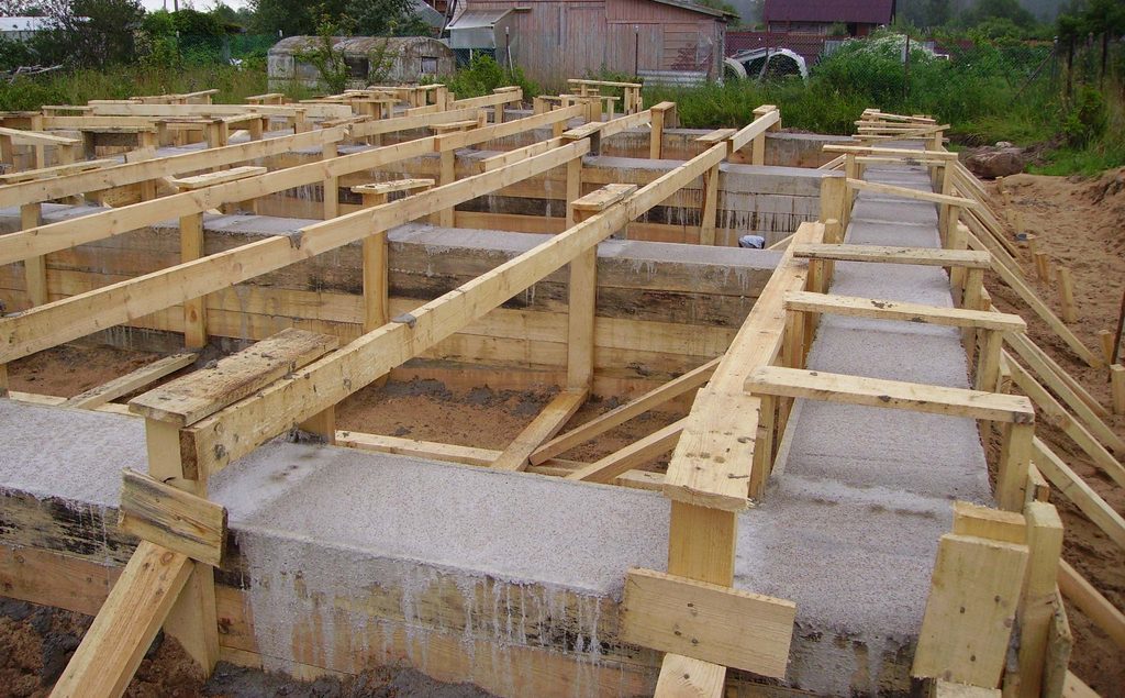 Давление раствора на стенки опалубки зависит от высоты конструкции. Чем выше фундамент, тем прочнее делаем деревянный каркас.
